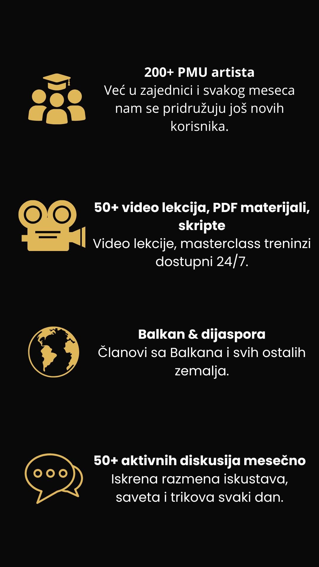 Dobijate edukacije za PMU, lekcije o marketingu, prodaji i poslovanju, redovna ažuriranja, PDF materijale i skripte, podršku 24/7 i pristup zatvorenoj grupi članova.